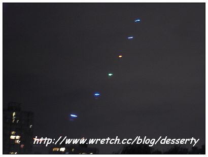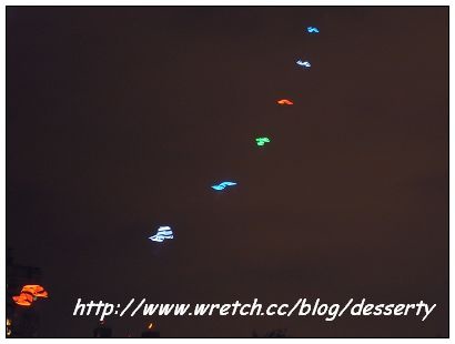 中和的四號公園有個民眾都會在這邊放風箏,可以放的很長很多,還能不斷追加風箏數,超強啦!之前在白天看過,相當佩服他的功力,想不到這回晚上經過,居然還看到他繼續放風箏,而且風箏上加了燈光,在黑嘛嘛的夜晚,特別顯眼。