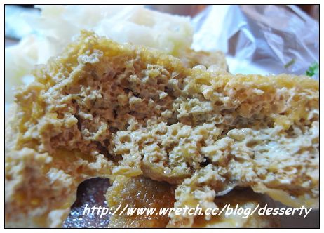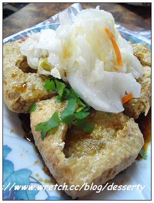 好不容易找到位置,趕緊坐下點單。只是上桌時有點愣住,咦?臭豆腐變大塊啦!以前不是方方正正一小塊嗎?不變的是一樣在中間挖洞,淋上醬油和蒜泥,這樣一個人享用,份量多多呢!